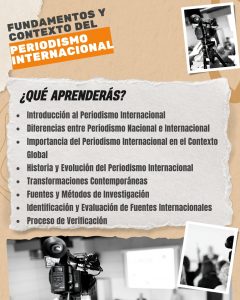 El curso de Fundamentos y Contexto del Periodismo Internacional ofrece una introducción integral a las bases teóricas y prácticas del periodismo en un entorno global. Se enfoca en los principios esenciales del periodismo, como la objetividad, la precisión, y la ética, y cómo estos se aplican en contextos internacionales.